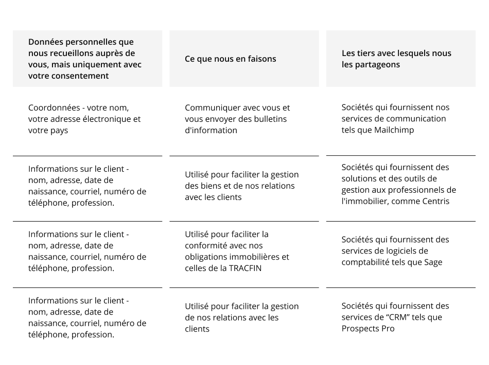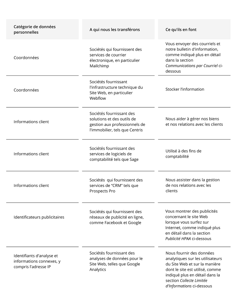 HPAA peut recueillir des données personnelles à votre sujet auprès de Centris afin de mieux répondre à vos besoins immobiliers. Si vous demandez des informations sur une propriété spécifique à Centris, nous recevrons votre nom, votre adresse électronique, votre numéro de téléphone et toute question que vous pourriez avoir concernant la propriété en question. Autrement, HPAA ne collecte pas de données personnelles vous concernant auprès de tiers. Exceptionnellement, dans la mesure où des identifiants analytiques ou publicitaires sont générés par des tiers, ceux-ci peuvent être considérés comme des données personnelles collectées auprès de tiers, et vous pouvez trouver des détails à ce sujet figurant plus loin dans la présente Politique.