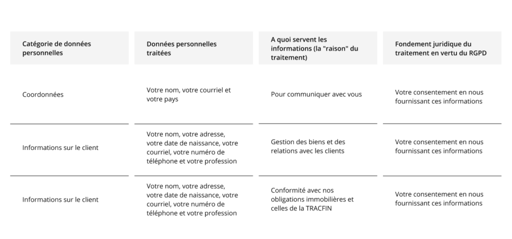Dans le tableau ci-dessous, veuillez trouver toutes les données personnelles que nous sommes susceptibles de collecter directement auprès de vous, ce pour quoi nous les utilisons, et la base juridique en vertu du RGPD nous permettant de détenir et de traiter ces données personnelles. En vertu de la LPRPDE et de la Loi sur la protection de la vie privée du Québec le fondement juridique de la collecte de vos données personnelles est votre consentement éclairé, et en soumettant ces données personnelles, vous reconnaissez avoir accordé ce consentement à HPAA.